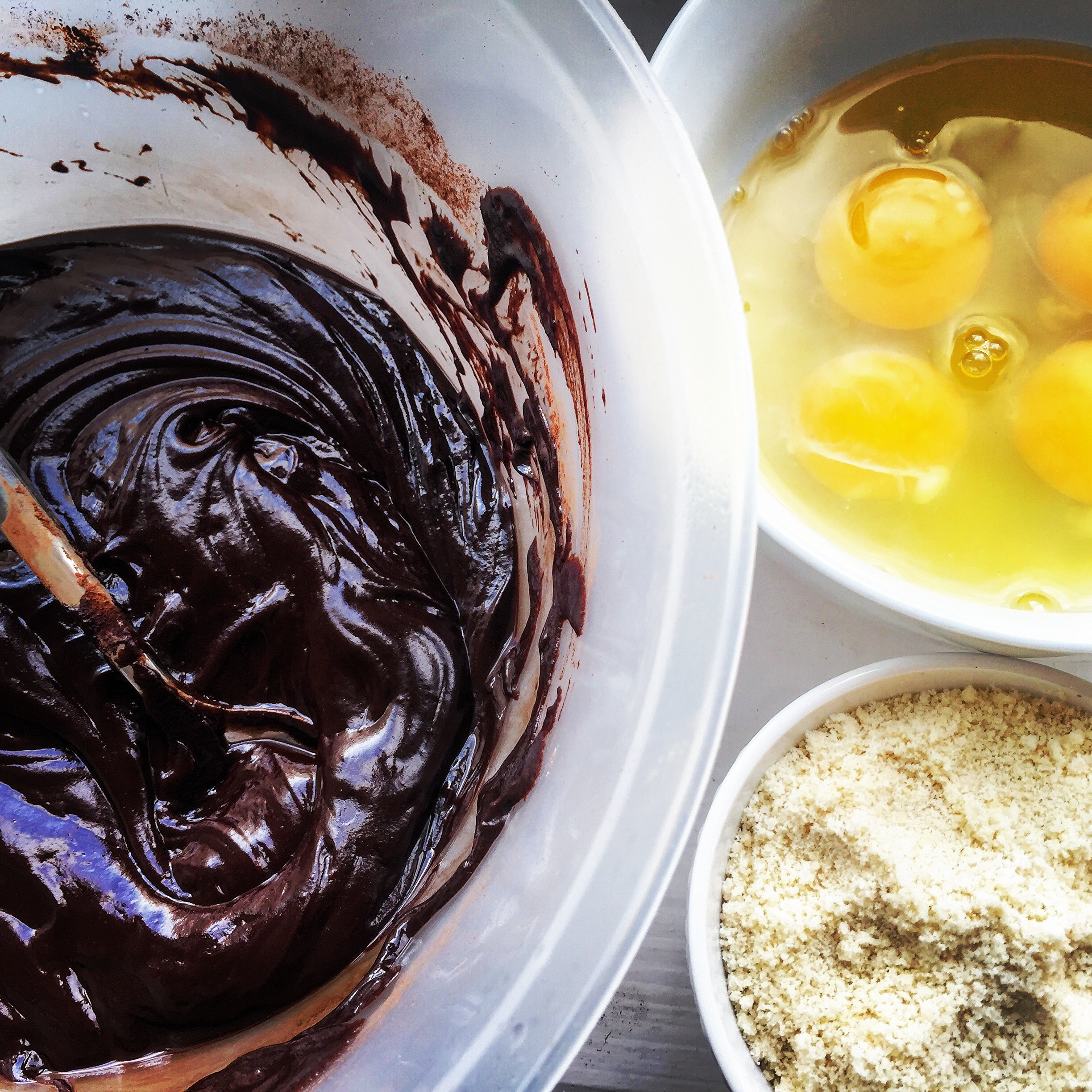 Mix the eggs into the raw chocolate then add the ground almonds and baking powder, stir to your hearts content, then pour the mix into a greaseproof lined dish.