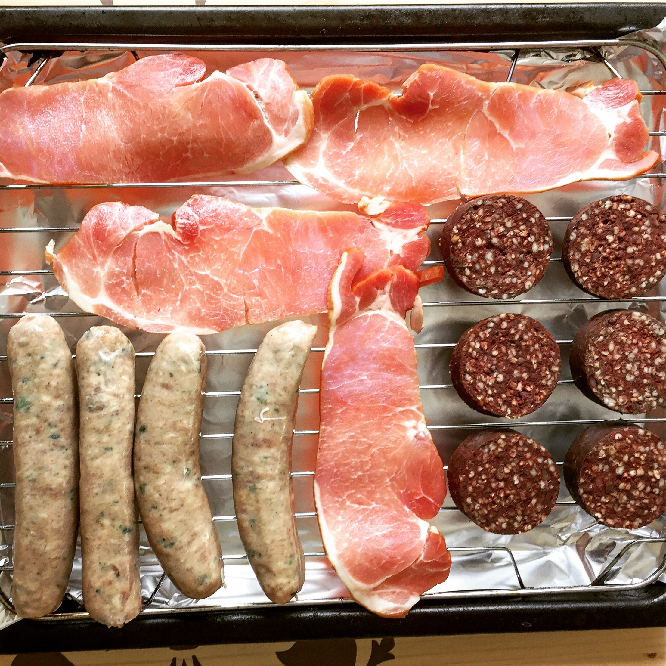 Place the fry ingredients on a lined wire baking tray (bacon, sausages and black pudding). Place in a preheated oven of 180 degrees Celsius.