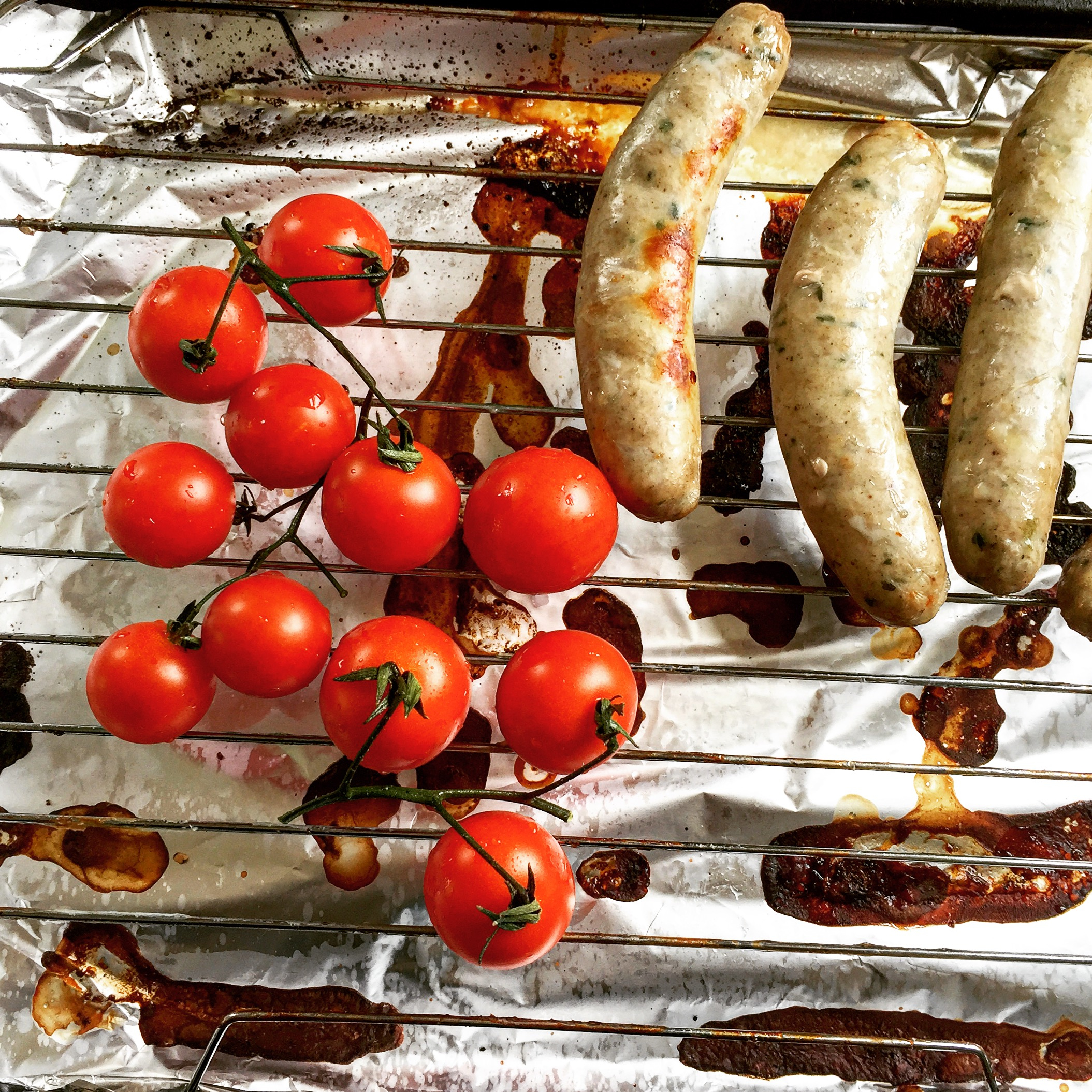 When the bacon and black pudding are cooked, place the tomatoes on the baking tray whilst the sausages finish cooking. (This just softens them slightly and makes them super juice and sweet!)