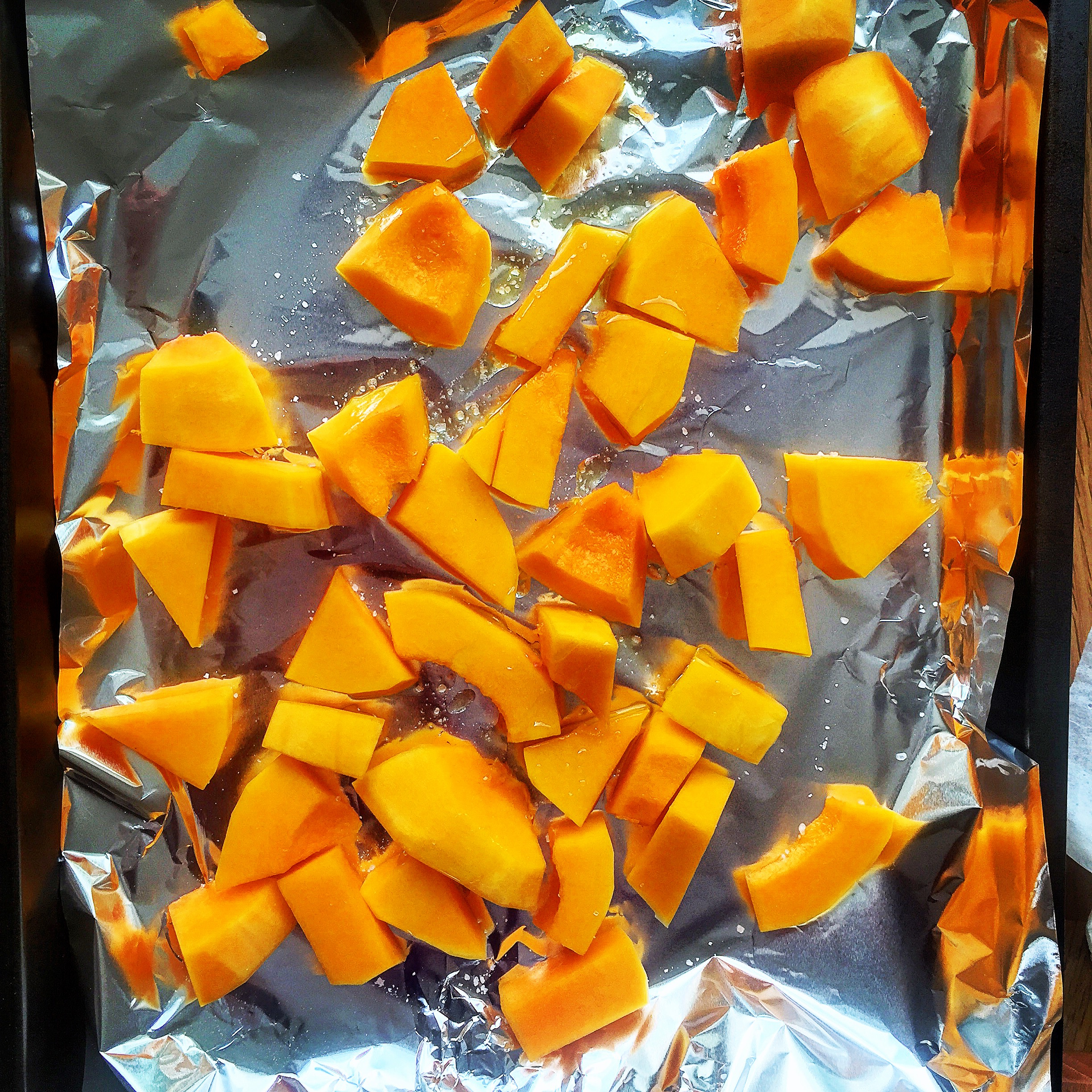 Place the chopped butternut squash on a baking tray and roast in the oven for 15 mins until tender and juicy.