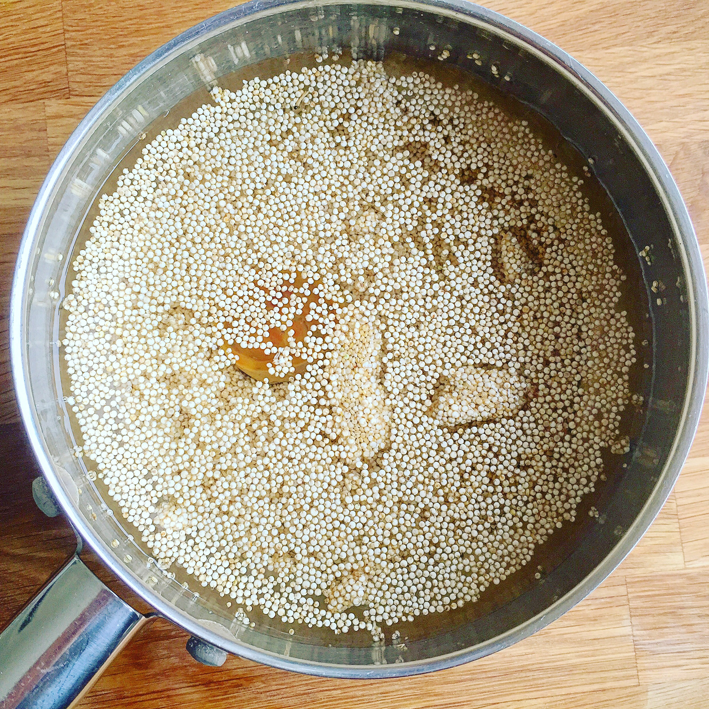 Now don’t freak out here people, its very simple so just take a breath. Place 1 cup of Quinoa into a saucepan with 3 cups of cold water and a veg stock cube if you have one, bring to the boil and once you see the Quinoa turning from little balls into little eyes (Just before you see the little tails hanging out) strain and leave to sit. Simples!