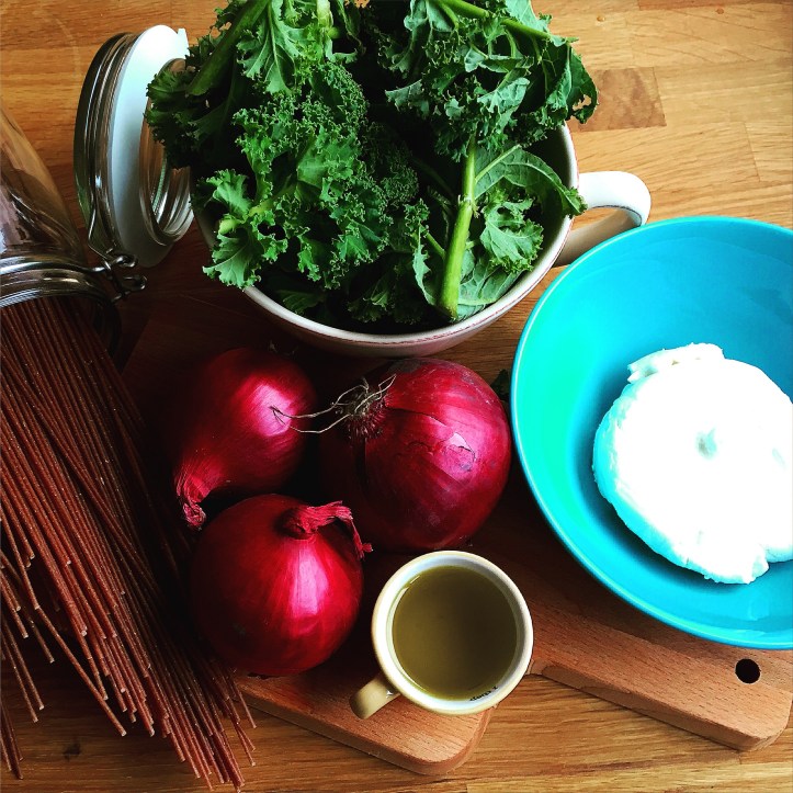 Ā So while the onions are cooking boil the kettle and get your pasta on! Throw the kale into the onions and cook for a further 5 minutes.