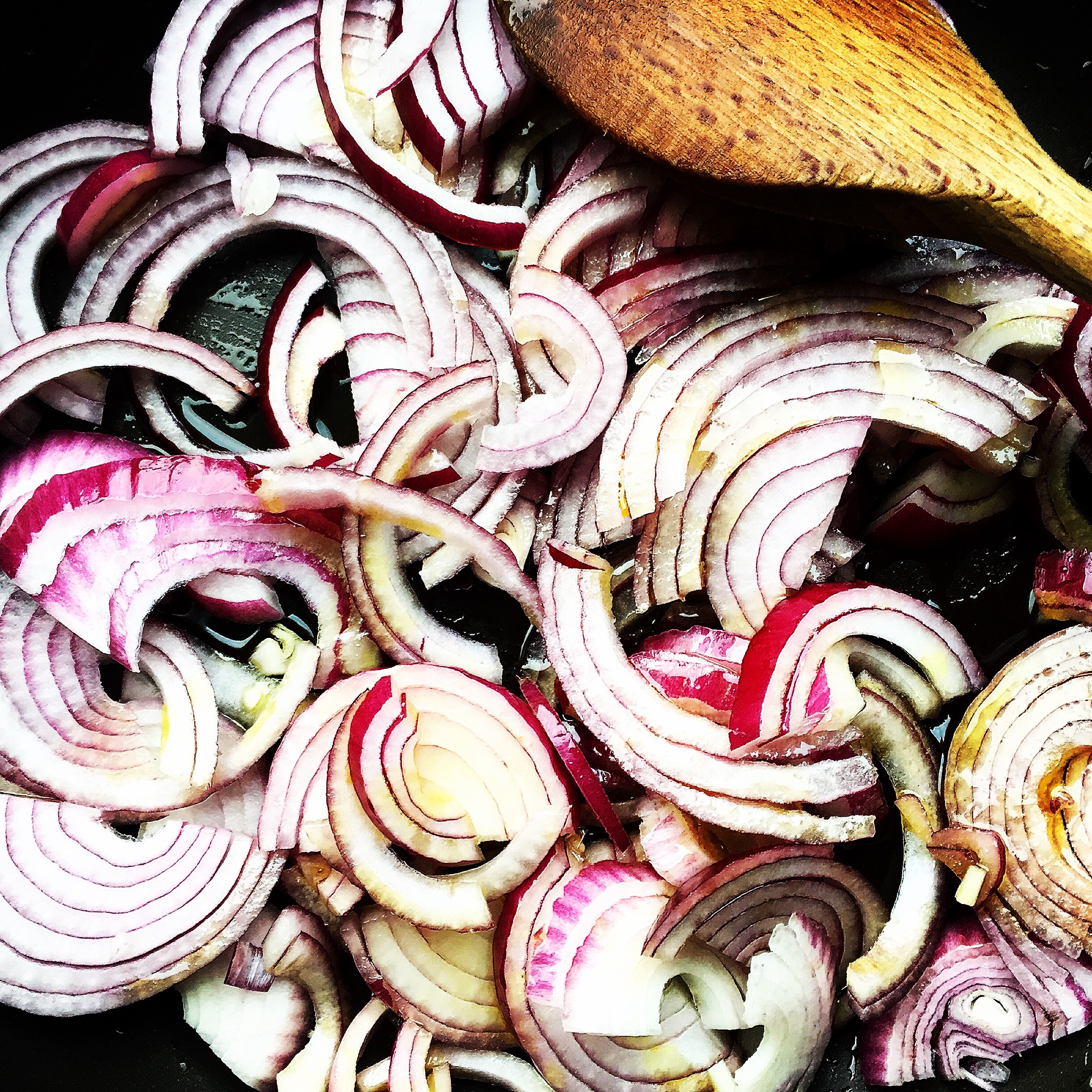All righty! First things firstā¦. Chop the red onions into strips and throw them into the frying pan with the olive oil. Turn the heat on half way and leave to cook slowly and caramelize for 15 minutes. Stir occasionally, if they look like theyāre burning then throw a little water on there, not too much, just a little. Low and slow baby, low and slow.