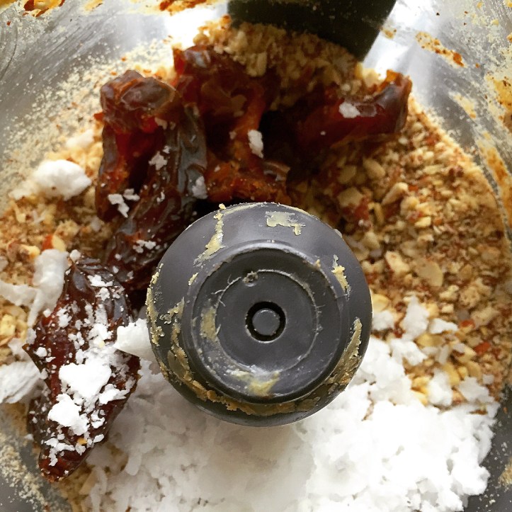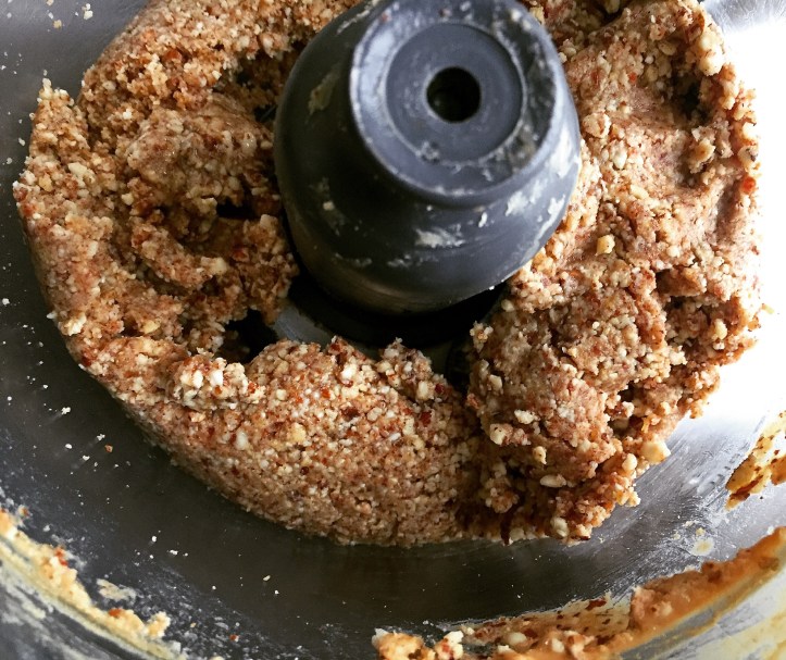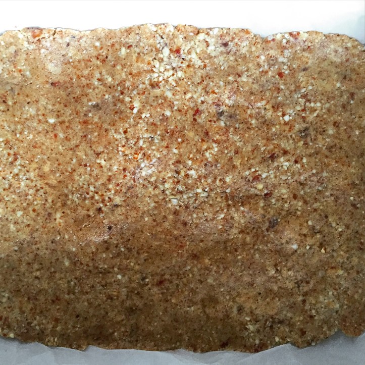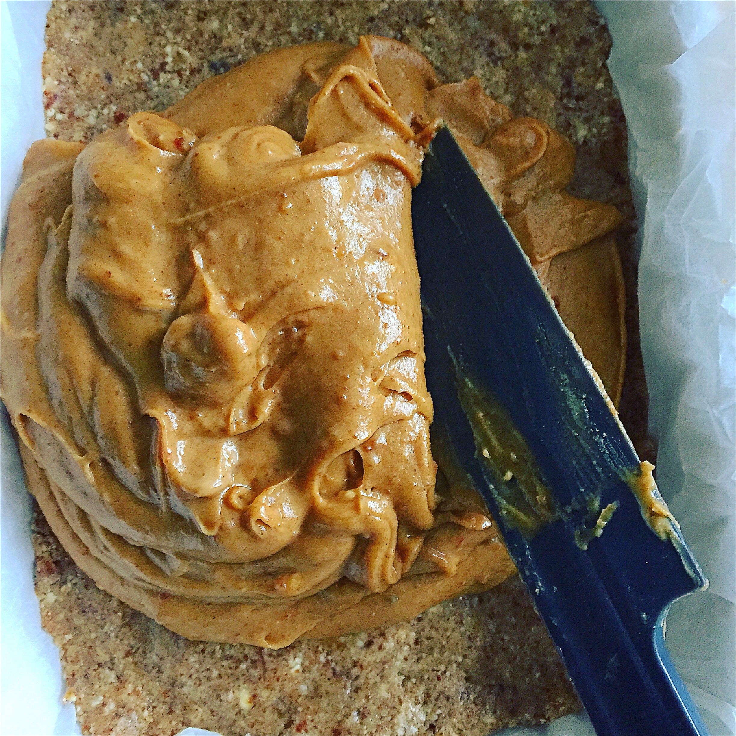 Next add the dates and coconut oil, whizz again until a dough-like consistency forms. Smoosh the nutty mixture into a parchment lined tray or tin, what eves just get it in!!!! Oh and then pop in the freezer! It makes the next step much easier!