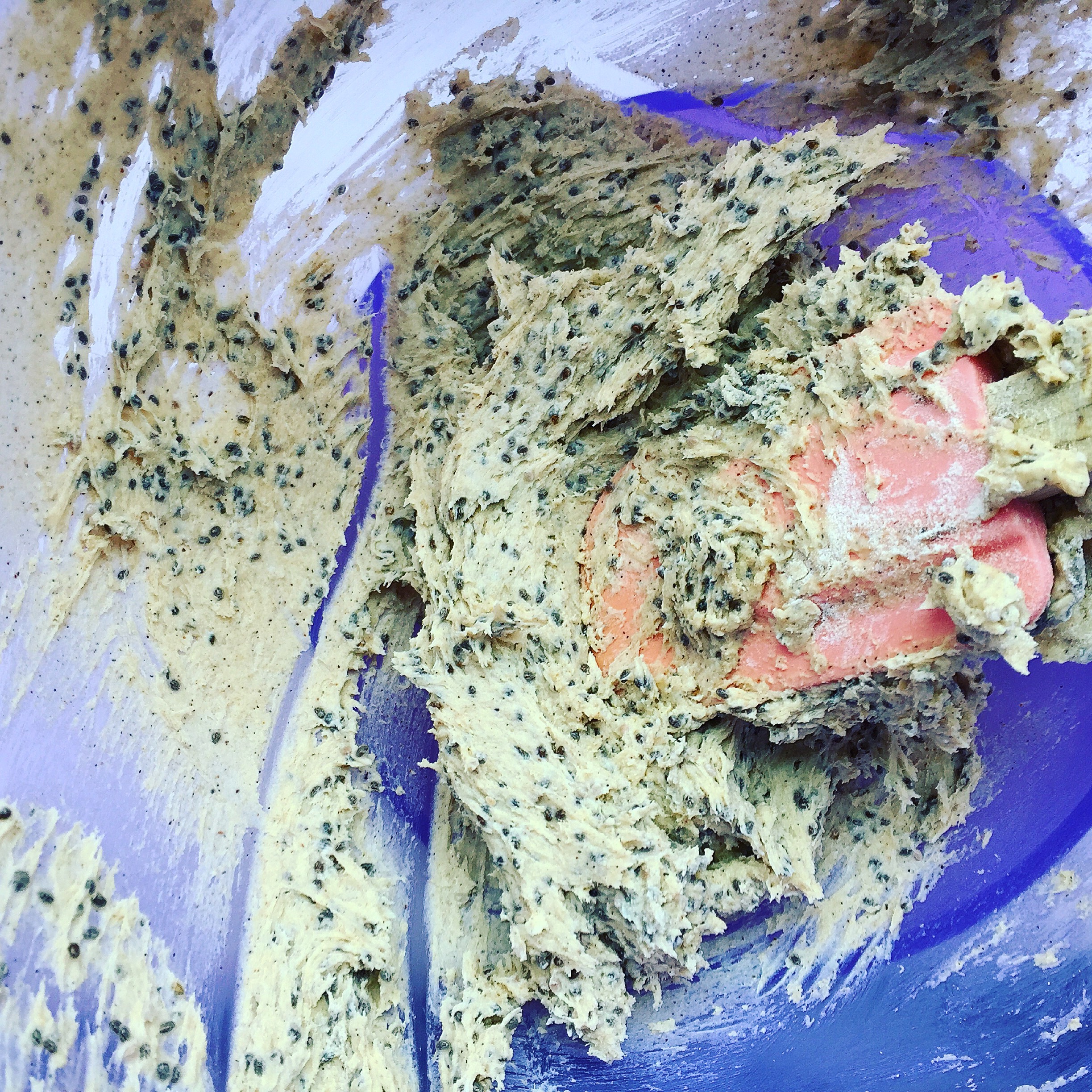 Lastly add all of the seeds and raisins. You should have beautifully colourful cookie dough now that looks something like this: