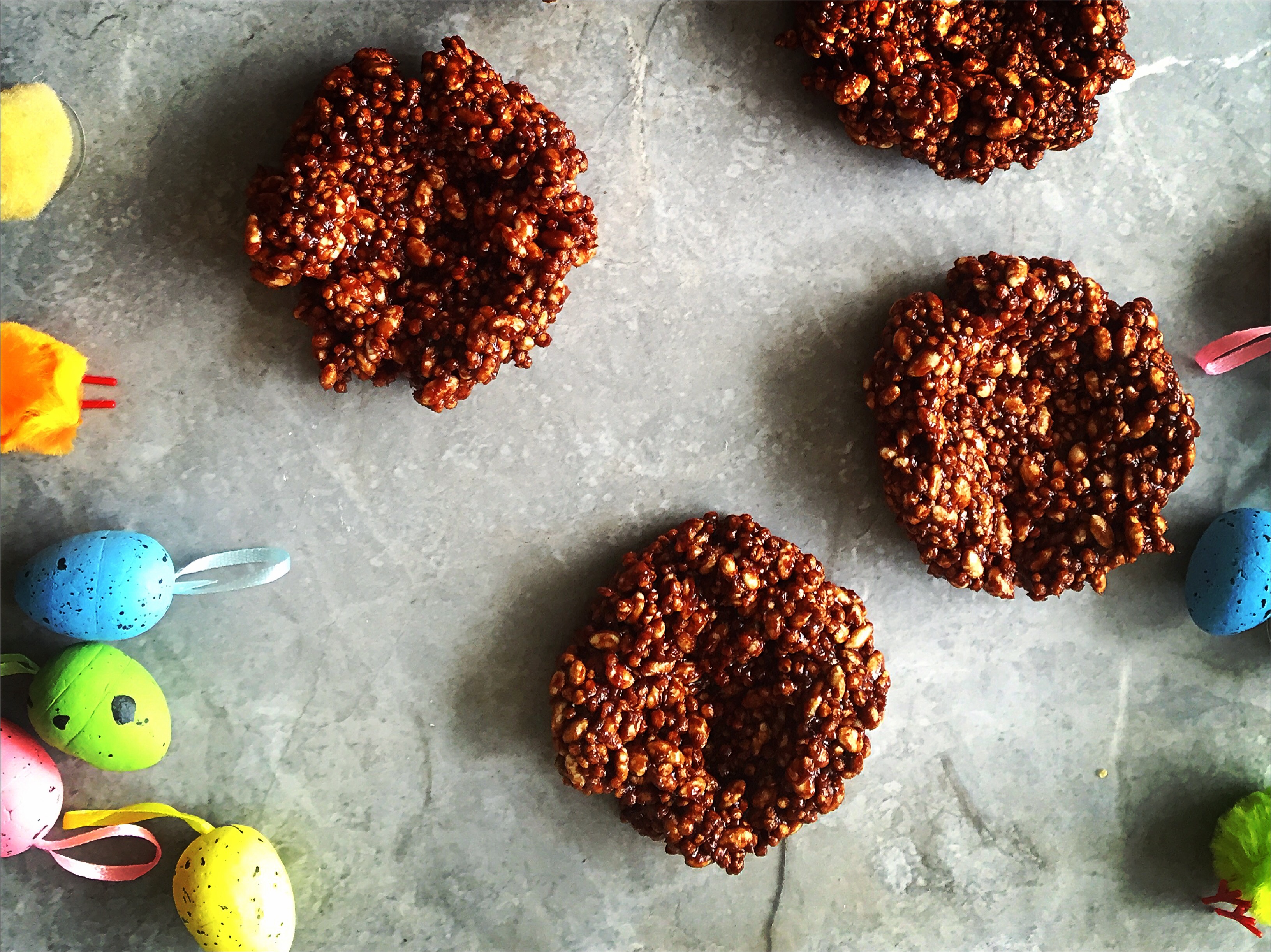 The last and most fun step is to grab a quarter of the mixture into one hand and roll it in your palms, into a ball, then pop it on the counter and push your thumb into the centre. You should now have something that resembles a nest! Wohoooo look at you you little chocolatier!