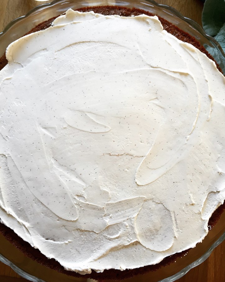 Next, mix the coconut yoghurt and maple syrup together, slather this all over one of the bases and then pop the other base on top.