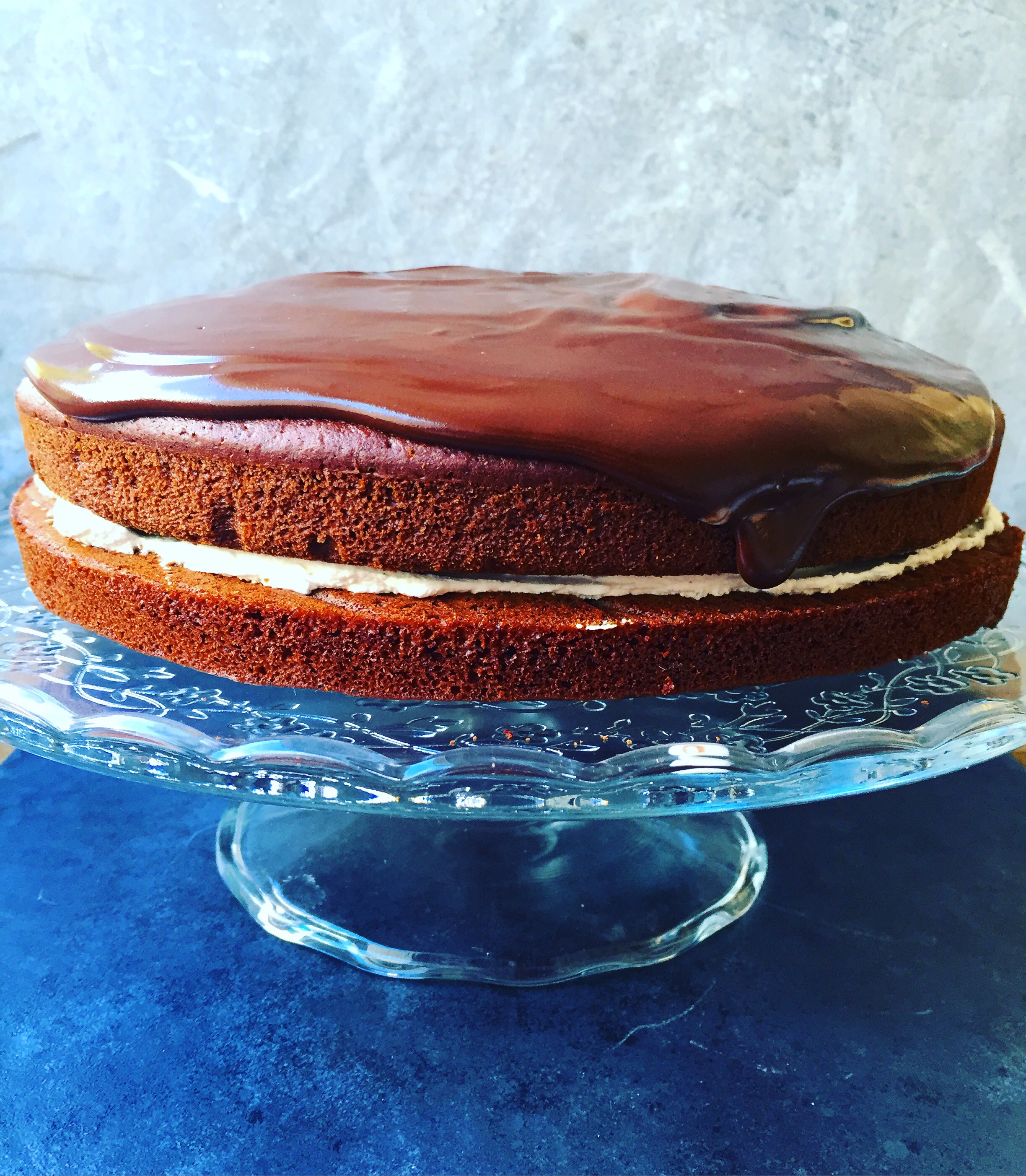 Last but not least melt the chocolate over a pot of hot water then whisk in the milk. Pour all over the cake and then stand back and admire.