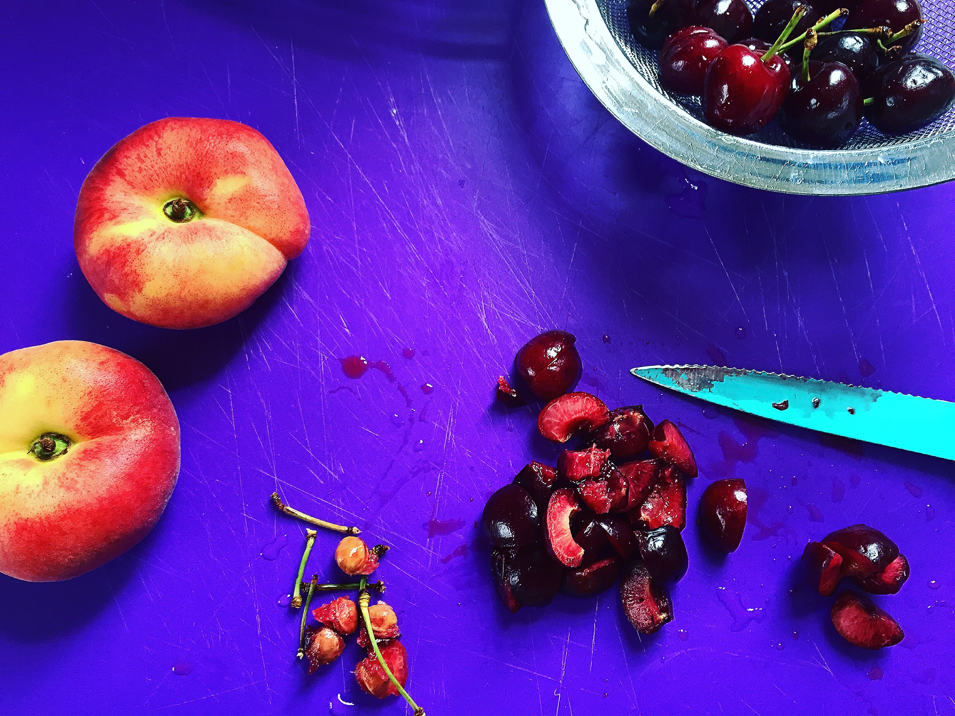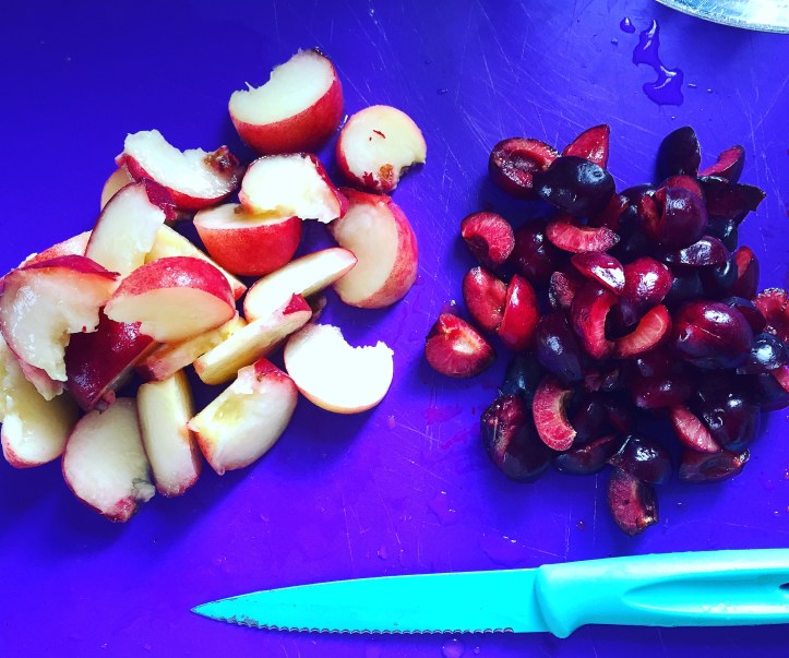 Once cooked set aside and chop your fruit! I find the easiest way to cut peaches and cherries is to run my knife down the middle of the fruit until you hit the stone and repeat on the other side. In basic terms place your knife on the fruit, push down until you hit the stone in the middle and then roll the knife forward so that it turns the fruit over whilst cutting. I then repeat this step so that I have little segments of fruit. I.e. cut the fruit in half, then quarters and then eights so the stone comes right off the little segments.