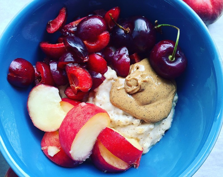 In terms of health well this porridge has the usual health benefits: boosts energy, protects skin, supports weight loss, helps to prevent diabetes, boosts heart health and reduces the chance of colon cancer. Wuuuhhhhaaaayyy Porridge! AND THEN when you top it with beautiful, seasonal produce like peaches and cherries you are also getting minerals such as calcium, potassium, magnesium, iron, manganese, phosphorous, zinc, and copper. If that wasnāt enough Peaches are also low in calories, contain no saturated fat or cholesterol and are a good source of dietary fiber. BOOOYAKASHA!!!!